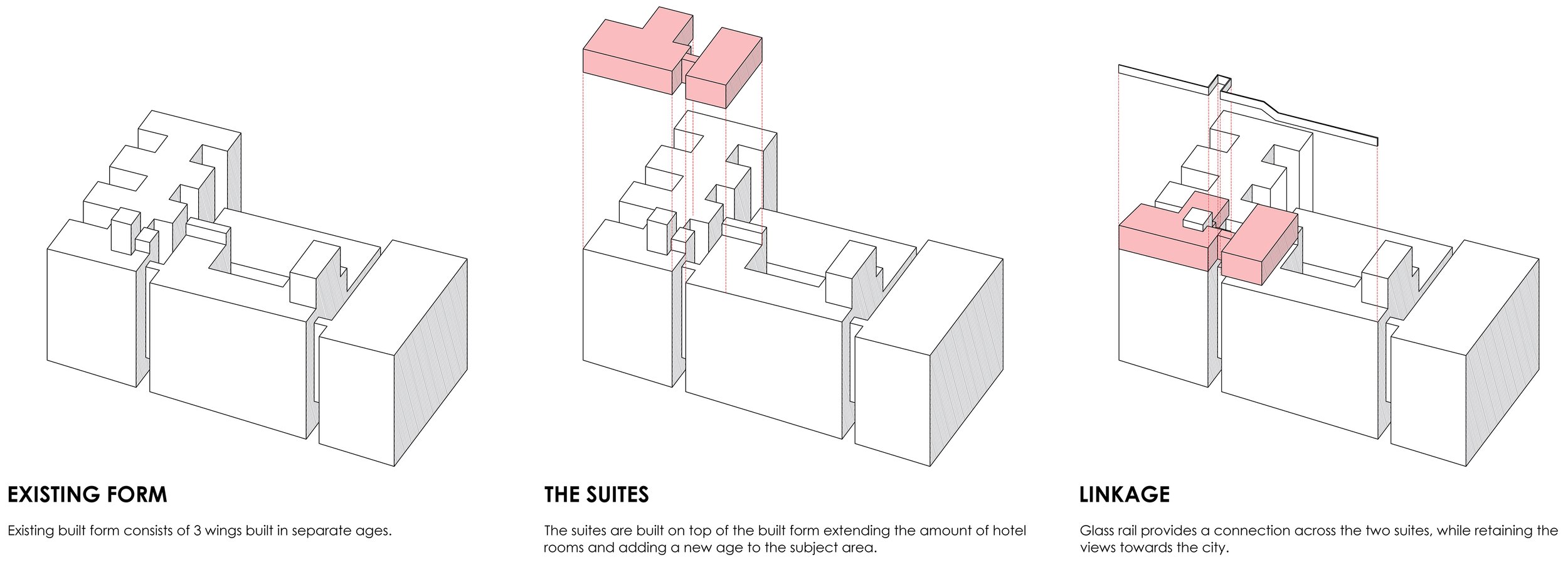 Responding to the unique roof form and structural conditions of the existing building, the extension adopts a parasitic architectural approach, prioritising adaptation and assimilation over replacement. This strategy allows the new intervention to respect the historical fabric while introducing a contemporary layer that enhances both the hotel’s functionality and its presence within the urban landscape.