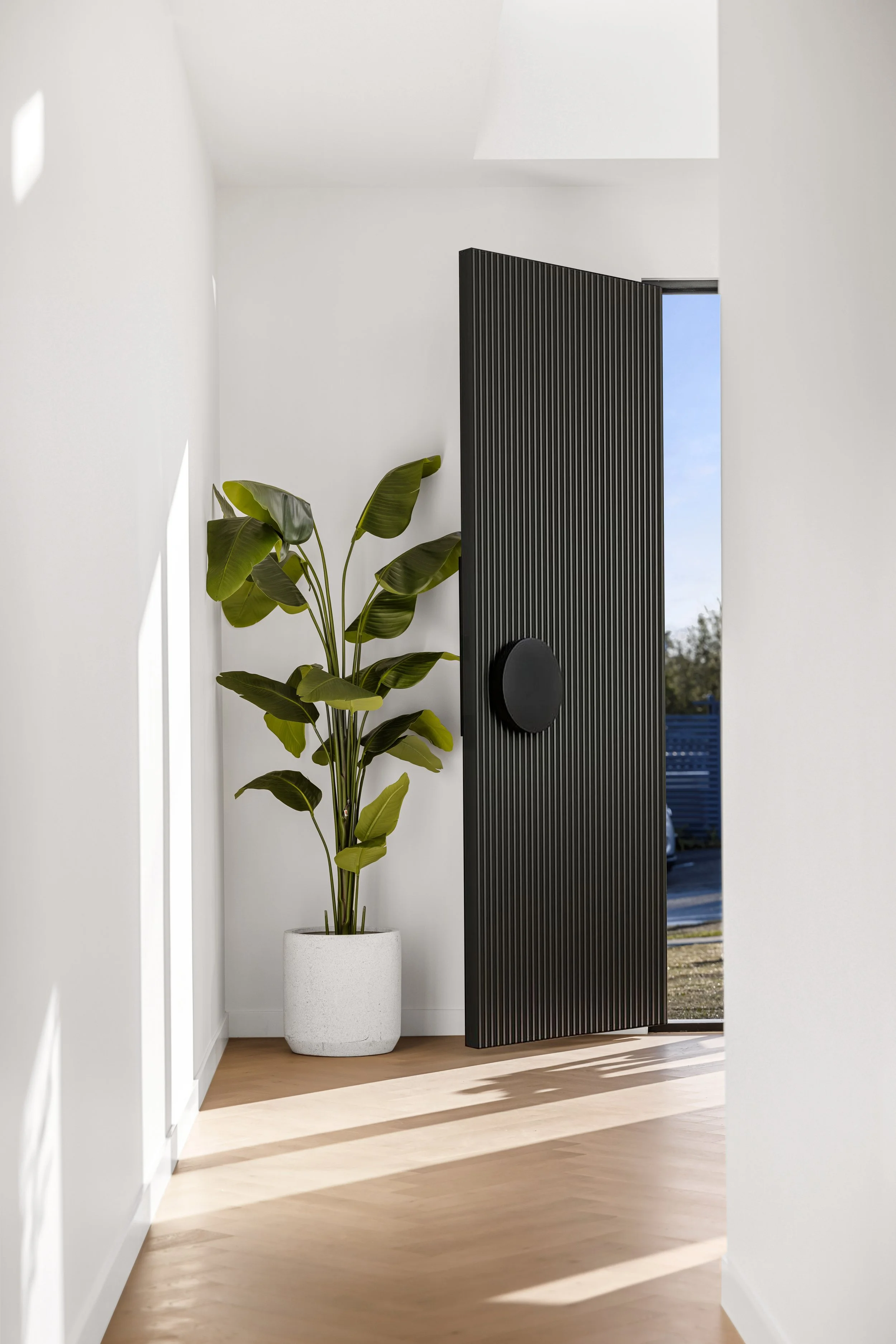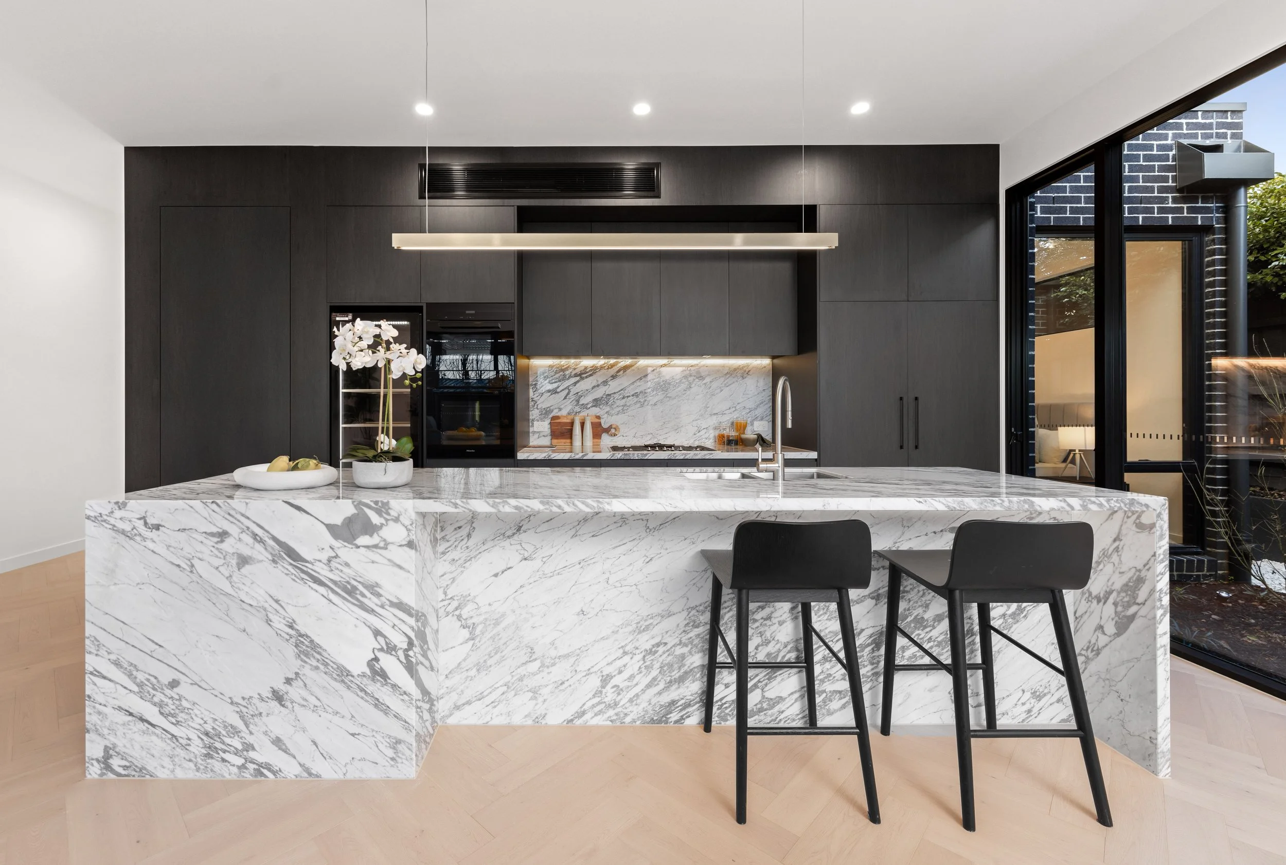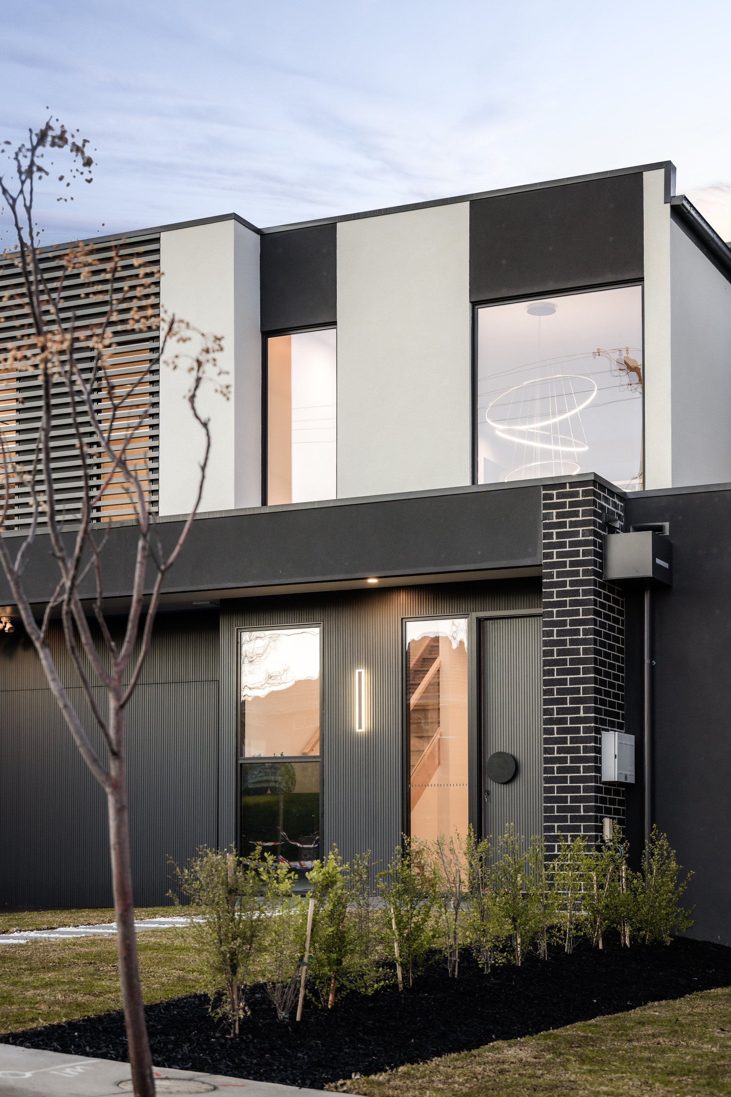 The site’s wide frontage allows a departure from the typical duplex model, with both homes featuring generous entries, double garages, and vertical volume at key moments. A feature courtyard introduces northern light deep into the plan, especially benefiting the ground-floor bedroom, enhancing liveability and solar performance.